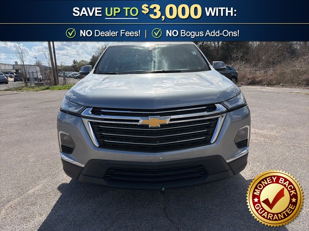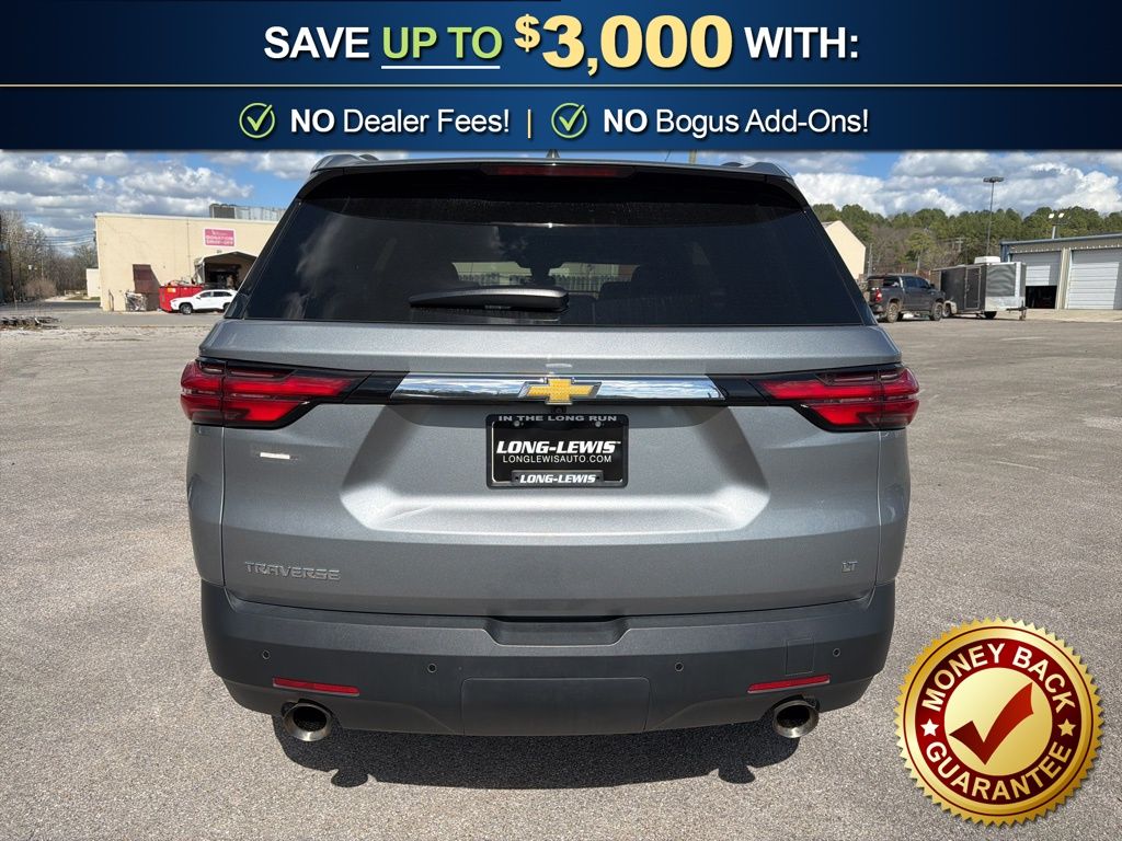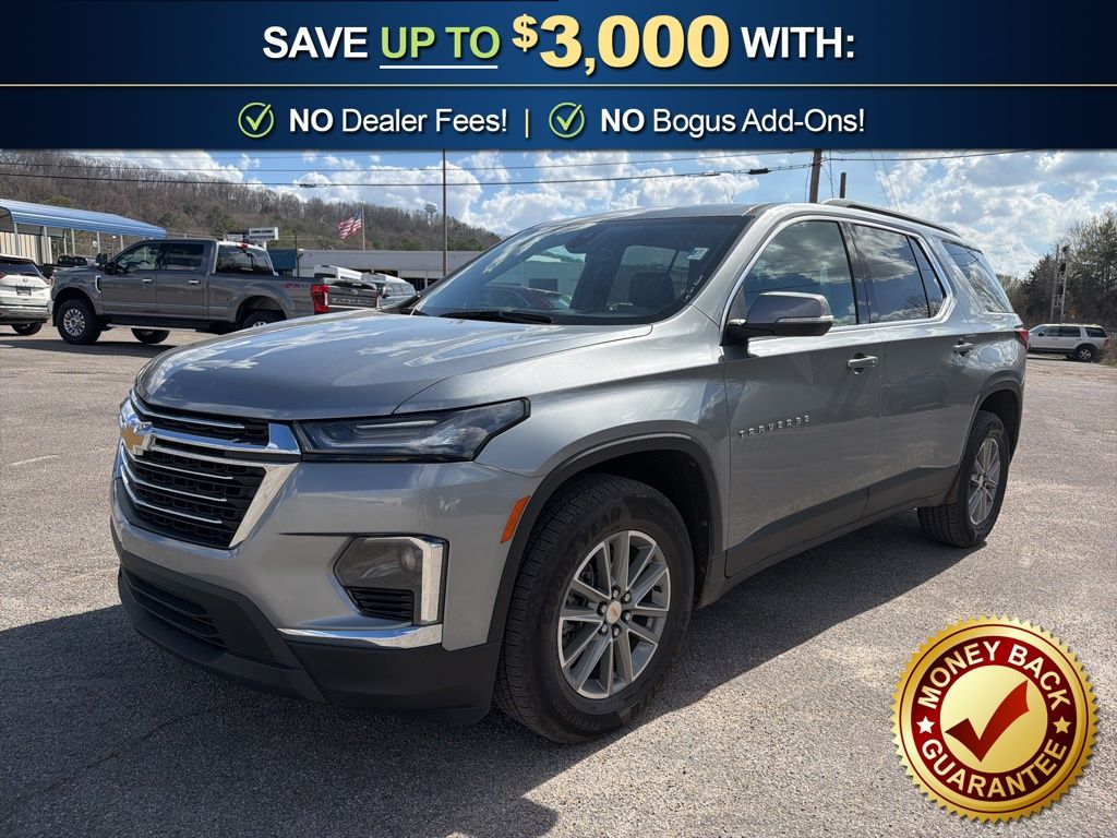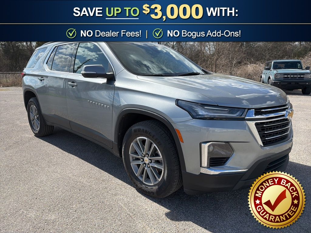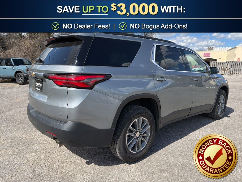 3.49 Axle Ratio, 3rd row seats: split-bench, 4-Wheel Disc Brakes, 6 Speakers, 6-Speaker Audio System Feature, 6-Way Power Front Passenger Seat, 8-Way Power Driver Seat Adjuster, ABS brakes, Air Conditioning, Alloy wheels, AM/FM radio: SiriusXM with 360L, Apple CarPlay/Android Auto, Auto High-beam Headlights, Automatic temperature control, Black Roof Rails, Brake assist, Bumpers: body-color, Compass, Delay-off headlights, Driver door bin, Driver vanity mirror, Dual front impact airbags, Dual front side impact airbags, Electronic Stability Control, Emergency communication system, Exterior Parking Camera Rear, Four wheel independent suspension, Front anti-roll bar, Front Bucket Seats, Front Center Armrest, Front dual zone A/C, Front License Plate Bracket Mounting Package, Front Passenger 2-Way Power Lumbar, Front reading lights, Fully automatic headlights, Garage door transmitter, Heated door mirrors, Heated Driver & Front Passenger Seats, Heated front seats, Heated steering wheel, Illuminated entry, Leather steering wheel, Leather-Appointed Seat Trim, Low tire pressure warning, Not Equipped w/Hood Insulator, Occupant sensing airbag, Outside temperature display, Overhead airbag, Overhead console, Panic alarm, Passenger door bin, Passenger vanity mirror, Power door mirrors, Power Driver Lumbar Control, Power driver seat, Power Liftgate, Power passenger seat, Power steering, Power windows, Preferred Equipment Group 3LT, Premium audio system: Chevrolet Infotainment 3 Plus, Radio data system, Radio: Chevrolet Infotainment 3 Plus System, Rear air conditioning, Rear anti-roll bar, Rear reading lights, Rear window defroster, Rear window wiper, Remote keyless entry, Security system, SiriusXM w/360L, Speed control, Speed-sensing steering, Spoiler, Steering wheel mounted audio controls, Tachometer, Telescoping steering wheel, Tilt steering wheel, Traction control, Trip computer, Turn signal indicator mirrors, Variably intermittent wipers, Voltmeter, Wheels: 18" Bright Silver-Painted Aluminum. 2023 Chevrolet Traverse LT Leather