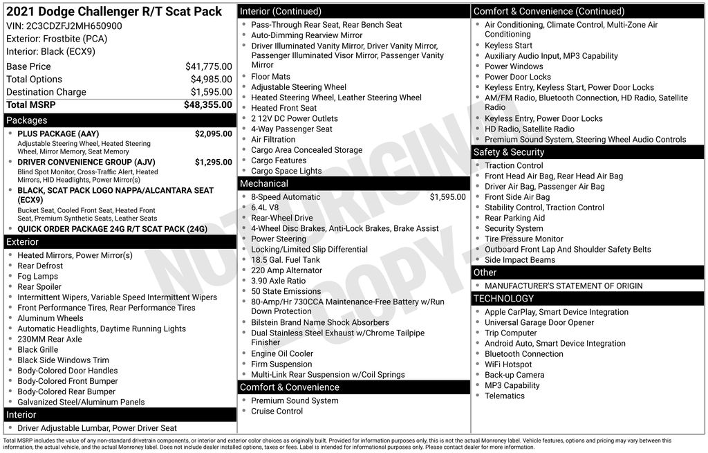 1-Yr SiriusXM Guardian Trial, 230MM Rear Axle, 3.09 Rear Axle Ratio, 4-Wheel Disc Brakes, 6 Speakers, ABS brakes, Air Conditioning, Alloy wheels, AM/FM radio: SiriusXM, Anti-whiplash front head restraints, Apple CarPlay, Apple CarPlay/Android Auto, Auto-dimming Rear-View mirror, Automatic temperature control, Blind Spot & Cross Path Detection, Brake assist, Bumpers: body-color, Compass, Delay-off headlights, Door Trim Panel w/Ambient Lighting, Driver Convenience Group, Driver door bin, Driver vanity mirror, Dual front impact airbags, Dual front side impact airbags, Electronic Stability Control, Emergency communication system: SiriusXM Guardian, Four wheel independent suspension, Front anti-roll bar, Front Bucket Seats, Front Center Armrest, Front dual zone A/C, Front fog lights, Front reading lights, Fully automatic headlights, Garage door transmitter, Google Android Auto, GPS Antenna Input, Heated door mirrors, Heated front seats, Heated Steering Wheel, Heated steering wheel, High-Intensity Discharge Headlamps, Illuminated entry, Integrated Center Stack Radio, Integrated Voice Command w/Bluetooth, Leather Shift Knob, Low tire pressure warning, Media Hub (2 USB, AUX), Outside temperature display, Overhead airbag, Overhead console, Panic alarm, ParkView Rear Back-Up Camera, Passenger door bin, Passenger vanity mirror, Plus Package, Power door mirrors, Power driver seat, Power Multi-Function Foldaway Mirrors, Power steering, Power Tilt/Telescope Steering Column, Power windows, Premium-Stitched Dash Panel, Quick Order Package 24G R/T Scat Pack, Radio data system, Radio: Uconnect 4C w/8.4" Display, Radio/Driver Seat/Mirrors Memory, Rear anti-roll bar, Rear reading lights, Rear seat center armrest, Rear window defroster, Remote keyless entry, Scat Pack Logo Houndstooth Seat, Security system, Shark Fin Antenna, SiriusXM Satellite Radio, Speed control, Speed-sensing steering, Split folding rear seat, Spoiler, Sport steering wheel, Steering wheel mounted audio controls, Tachometer, Telescoping steering wheel, Tilt steering wheel, Traction control, Trip computer, USB Host Flip, Variably intermittent wipers, Wheels: 20" x 9" Lo Gloss Granite Crystal. 2021 Dodge Challenger R/T Scat Pack
