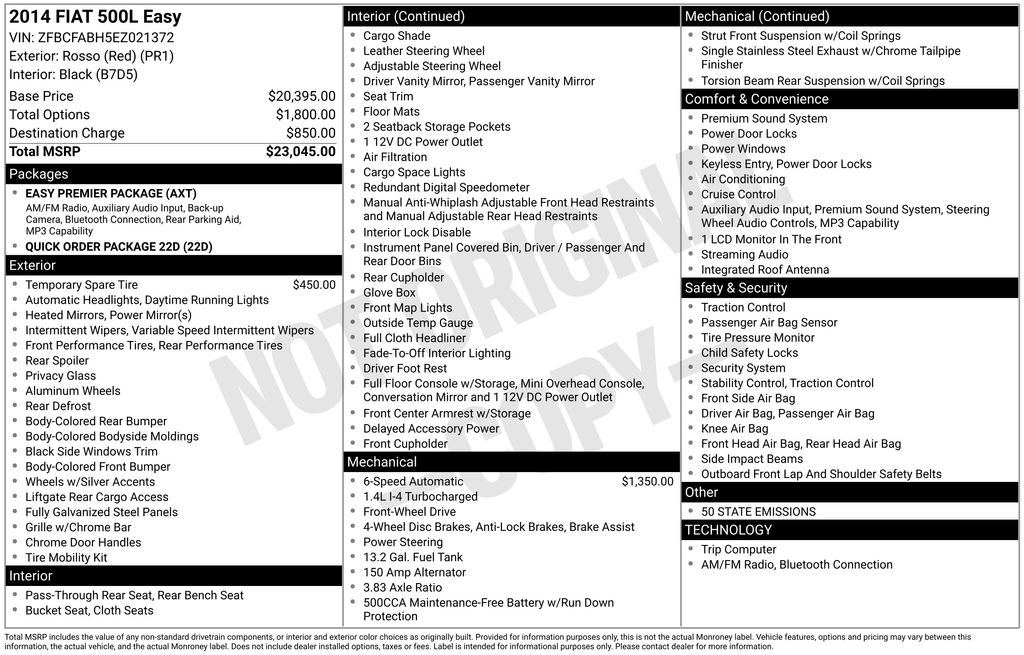 2014 Fiat 500L Easy Rosso (Red) Easy FWD 6-Speed C633 Euro Twin Clutch 1.4L I4 16V MultiAir Turbocharged 16" Aluminum Wheels, 4-Wheel Disc Brakes, 6 Speakers, ABS brakes, Air Conditioning, Alloy wheels, AM/FM radio, Anti-whiplash front head restraints, Black Seats w/Gray I/P 298, Bodyside moldings, Brake assist, Bumpers: body-color, Cloth Low-Back Bucket Seats, Delay-off headlights, Driver door bin, Driver vanity mirror, Dual front impact airbags, Dual front side impact airbags, Easy Premier Package (DISC), Electronic Stability Control, Front anti-roll bar, Front Bucket Seats, Front Center Armrest w/Storage, Front reading lights, Front wheel independent suspension, Gray Instrument Panel Bezels, Heated door mirrors, Illuminated entry, Knee airbag, Leather steering wheel, Low tire pressure warning, Media Hub (SD, USB, AUX), Nav-Capable See Dealer for Details, Occupant sensing airbag, Outside temperature display, Overhead airbag, Overhead console, ParkSense Rear Park Assist System, ParkView Rear Back-Up Camera, Passenger door bin, Passenger vanity mirror, Power door mirrors, Power steering, Power windows, Quick Order Package 22D, Radio data system, Radio: Uconnect 5.0 AM/FM/BT, Radio: Uconnect 6.5A AM/FM/BT/Voice, Rear window defroster, Rear window wiper, Remote keyless entry, Security system, Speed control, Split folding rear seat, Spoiler, Steering wheel mounted audio controls, Tachometer, Telescoping steering wheel, Tilt steering wheel, Traction control, Trip computer, Variably intermittent wipers.