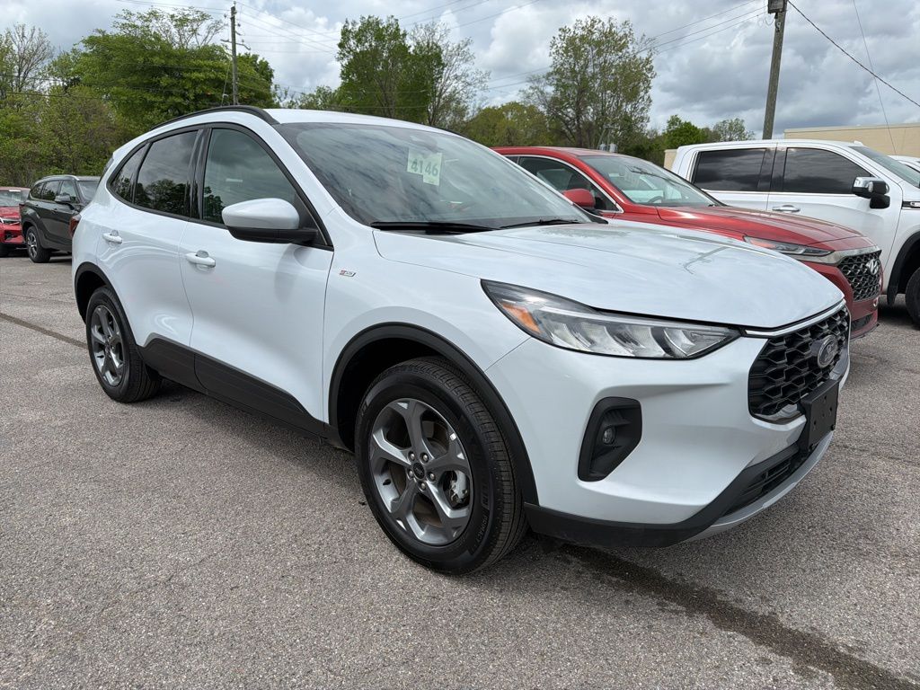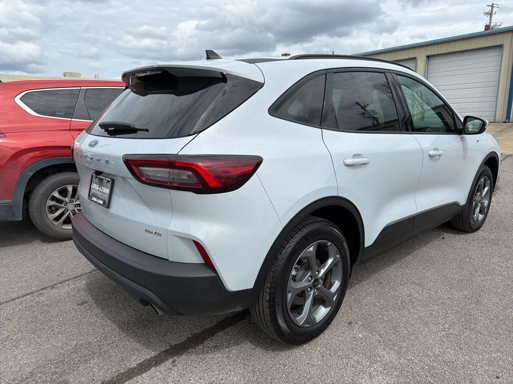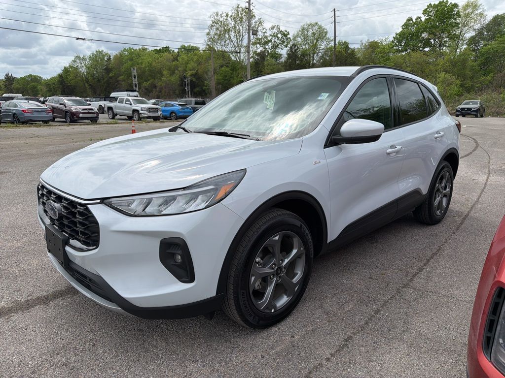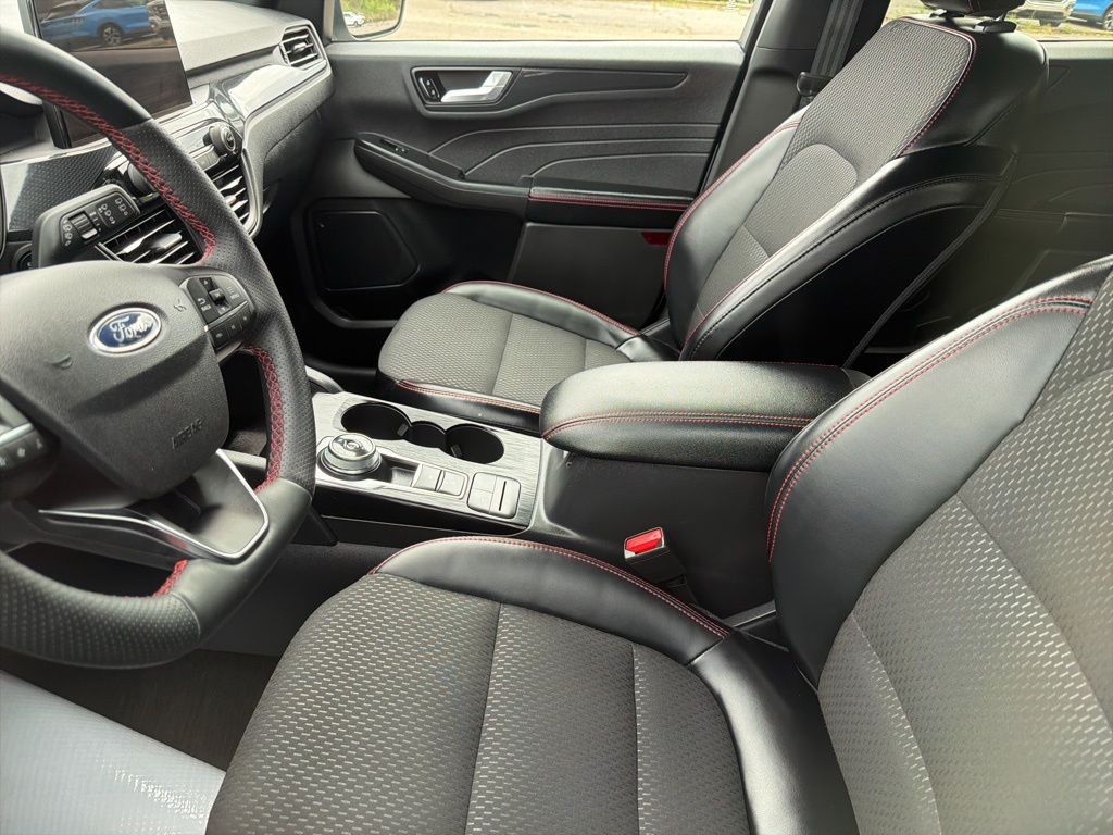 AWD, 2.91 Axle Ratio, 4-Wheel Disc Brakes, 6 Speakers, ABS brakes, Air Conditioning, Alloy wheels, AM/FM radio: SiriusXM, AM/FM Stereo, Auto High-beam Headlights, Automatic temperature control, Brake assist, Bumpers: body-color, Compass, Delay-off headlights, Driver door bin, Driver vanity mirror, Dual front impact airbags, Dual front side impact airbags, Electronic Fuel Door Release, Electronic Stability Control, Emergency communication system: SYNC 4 911 Assist, Equipment Group 401A, FordPass Connect, Four wheel independent suspension, Front anti-roll bar, Front Bucket Seats, Front Center Armrest, Front dual zone A/C, Front fog lights, Front reading lights, Fully automatic headlights, Heated door mirrors, Heated front seats, Heated steering wheel, Heated Vinyl/Cloth Front Sport Contour Bucket Seats, Illuminated entry, Internet access capable: FordPass Connect 4G, Knee airbag, Low tire pressure warning, Neutral Towing Capability, Occupant sensing airbag, Outside temperature display, Overhead airbag, Overhead console, Panic alarm, Passenger door bin, Passenger vanity mirror, Pedestrian Alert Sounder, Power door mirrors, Power driver seat, Power Liftgate, Power steering, Power windows, Radio data system, Rear anti-roll bar, Rear reading lights, Rear seat center armrest, Rear window defroster, Rear window wiper, Remote keyless entry, Speed control, Speed-sensing steering, Speed-Sensitive Wipers, Split folding rear seat, Spoiler, Sport steering wheel, Steering wheel mounted audio controls, SYNC 4, Tachometer, Telescoping steering wheel, Tilt steering wheel, Traction control, Trip computer, Variably intermittent wipers, Wheels: 18" Rock Metallic Painted Aluminum, AWD. 2025 Ford Escape ST-Line Select