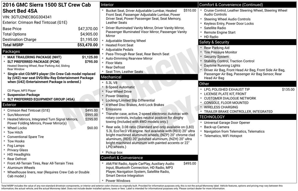 8-Speed Automatic with Overdrive, 4WD, Black Leather, 10-Way Power Driver's Seat Adjuster, 110-Volt AC Power Outlet, 150 Amp Alternator, 2-Speed Active Electronic AutoTrac Transfer Case, 4-Wheel Disc Brakes, 4.2" Diagonal Color Display Driver Info Center, 40/20/40 Front Split Bench Seat, 6 Speakers, 6-Speaker Audio System, ABS brakes, Adjustable pedals, Air Conditioning, Alloy wheels, AM/FM radio: SiriusXM, Auto-dimming door mirrors, Auto-Dimming Inside Rear-View Mirror, Auto-dimming Rear-View mirror, Automatic temperature control, Auxiliary External Transmission Oil Cooler, Bodyside moldings, Brake assist, Bumpers: chrome, CD player, Chrome Bodyside Moldings, Chrome Door Handles, Chrome Heated Outside Vertical Trailering Mirrors, Chrome Mirror Caps, Color-Keyed Carpeting w/Rubberized Vinyl Floor Mats, Compass, Deep-Tinted Glass, Delay-off headlights, Driver & Front Passenger Illuminated Vanity Mirrors, Driver door bin, Driver vanity mirror, Dual front impact airbags, Dual front side impact airbags, Dual-Zone Automatic Climate Control, Electric Rear-Window Defogger, Electronic Stability Control, Emergency communication system: OnStar Guidance, Enhanced Cooling Radiator, Exterior Parking Camera Rear, EZ Lift & Lower Tailgate, Floor Mounted Console, Front anti-roll bar, Front Center Armrest w/Storage, Front dual zone A/C, Front fog lights, Front Frame-Mounted Black Recovery Hooks, Front Full Feature Power Reclining Bucket Seats, Front License Plate Kit, Front reading lights, Front wheel independent suspension, Fully automatic headlights, Garage door transmitter: HomeLink, HD Radio, Heated door mirrors, Heated Driver & Front Passenger Seats, Heated front seats, Heavier Duty Rear Springs, Heavy Duty Suspension, Heavy-Duty Rear Locking Differential, Illuminated entry, Increased RGAWR, Integrated Trailer Brake Controller, Leather Appointed Seat Trim, Leather Wrapped Heated Steering Wheel, Leather Wrapped Steering Wheel w/Cruise Controls, LED Cargo Box Lighting, LED Tailamps w/Signature, Low tire pressure warning, Manual Tilt/Telescoping Steering Column, Max Trailering Package, Memory seat, Occupant sensing airbag, OnStar 6 Month Guidance Plan, OnStar w/4G LTE, Outside temperature display, Overhead airbag, Overhead console, Panic alarm, Passenger door bin, Passenger vanity mirror, Polished Exhaust Tip, Power Adjustable Pedals, Power door mirrors, Power driver seat, Power Folding & Adjustable Heated Outside Mirrors, Power passenger seat, Power Sliding Rear Window w/Defogger, Power steering, Power Sunroof, Power windows, Power Windows w/Driver Express Up & Down, Preferred Equipment Group 4SA, Premium audio system: IntelliLink, Radio data system, Radio: AM/FM Stereo w/8" Diagonal Color Touch Nav., Radio: AM/FM Stereo w/8" Diagonal Color Touch Screen, Rear 60/40 Folding Bench Seat (Folds Up), Rear reading lights, Rear seat center armrest, Rear step bumper, Rear Vision Camera w/Dynamic Guide Lines, Rear Wheelhouse Liners, Rear window defroster, Remote Keyless Entry, Remote keyless entry, Remote Vehicle Starter System, Security system, Single Slot CD/MP3 Player, SiriusXM Satellite Radio, SLT Preferred Package, Speed control, Speed-sensing steering, Split folding rear seat, Steering Wheel Audio Controls, Steering wheel mounted audio controls, Tachometer, Telescoping steering wheel, Theft Deterrent System (Unauthorized Entry), Thin Profile LED Front Fog Lamps, Tilt steering wheel, Traction control, Trailering Equipment, Trip computer, Turn signal indicator mirrors, Ultrasonic Front & Rear Park Assist, Universal Home Remote, Variably intermittent wipers, Voltmeter, Wheel Locks (Set of 4) (LPO), Wheels: 18" x 8.5" Polished Aluminum, Wireless Charging, 8-Speed Automatic with Overdrive, 4WD, Black Leather. 2016 GMC Sierra 1500 SLT