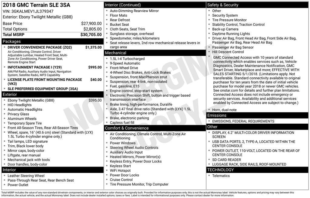 Drive in style with this Ebony Twilight Metallic 2018 GMC Terrain SLE featuring a Medium Ash Gray Cloth Interior. Powered by a 1.5L Turbo 4-Cylinder Engine with 9-Speed Automatic Transmission, its the perfect mix of efficiency and performance.