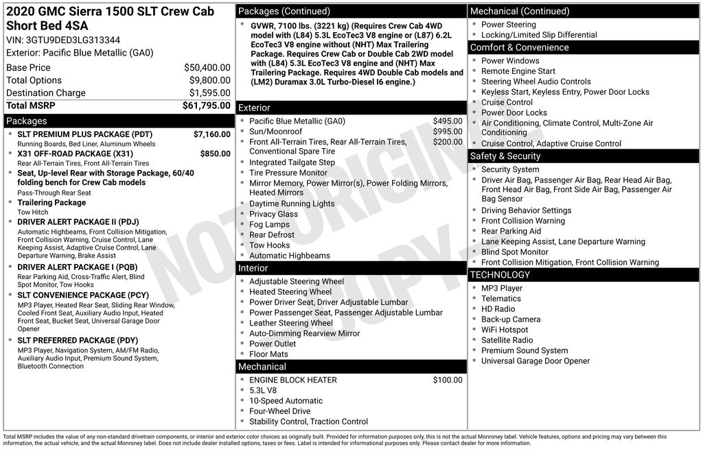 2020 GMC Sierra 1500 SLT Pacific Blue Metallic SLT 4WD 10-Speed Automatic EcoTec3 5.3L V8 10-Speed Automatic, 4WD, Jet Black Leather, 10-Way Power Driver Seat Adjuster w/Lumbar, 10-Way Power Passenger Seat Adjuster w/Lumbar, 12-Volt Rear Auxiliary Power Outlet, 120-Volt Bed Mounted Power Outlet, 120-Volt Instrument Panel Power Outlet, 170 Amp Alternator, 2 USB Ports, 2 USB Ports (1st Row), 20" x 9" Polished Aluminum Wheels, 3.23 Rear Axle Ratio, 4-Wheel Disc Brakes, 4G LTE Wi-Fi Hotspot Capable, 6 Speakers, 6-Speaker Audio System Feature, ABS brakes, Adaptive Cruise Control - Camera, Air Conditioning, Alloy wheels, AM/FM radio: SiriusXM with 360L, Apple CarPlay/Android Auto, Auto-dimming door mirrors, Auto-dimming Rear-View mirror, Automatic Emergency Braking, Automatic temperature control, Auxiliary External Transmission Oil Cooler, Brake assist, Bumpers: chrome, Chrome Grille, Chrome Wheel To Wheel Assist Steps, Color-Keyed Carpeting Floor Covering, Compass, Deep-Tinted Glass, Delay-off headlights, Driver Alert Package I, Driver Alert Package II, Driver door bin, Driver Memory, Driver vanity mirror, Dual Exhaust w/Premium Tips, Dual front impact airbags, Dual front side impact airbags, Electric Rear-Window Defogger, Electrical Lock Control Steering Column, Electronic Stability Control, Engine Block Heater, Floor-Mounted Center Console, Following Distance Indicator, Forward Collision Alert, Front 40/20/40 Split-Bench Seat, Front anti-roll bar, Front Bucket Seats, Front Center Armrest w/Storage, Front dual zone A/C, Front fog lights, Front Frame-Mounted Black Recovery Hooks, Front License Plate Kit, Front Pedestrian Braking, Front reading lights, Front wheel independent suspension, Fully automatic headlights, GMC Connected Access Capable, HD Radio, Heated 2nd Row Outboard Seats, Heated door mirrors, Heated Driver & Front Outboard Passenger Seating, Heated front seats, Heated steering wheel, Heavy Duty Suspension, Heavy-Duty Rear Locking Differential, High-Capacity Air Filter, Hill Descent Control, Hitch Guidance, Hitch Guidance w/Hitch View, Illuminated entry, In-Vehicle Trailering App, Integrated Trailer Brake Controller, IntelliBeam Automatic High Beam On/Off, Keyless Open & Start, Lane Change Alert w/Side Blind Zone Alert, Lane Keep Assist w/Lane Departure Warning, LED Cargo Area Lighting, Low tire pressure warning, Manual Tilt-Wheel & Telescoping Steering Column, Memory seat, Occupant sensing airbag, Off-Road Suspension, OnStar & GMC Connected Services Capable, Outside temperature display, Overhead airbag, Overhead console, Panic alarm, Passenger door bin, Passenger vanity mirror, Perforated Leather-Appointed Front Seat Trim, Perimeter Lighting, Power Door Locks, Power door mirrors, Power driver seat, Power Front Passenger Windows w/Express Up/Down, Power Front Windows w/Driver Express Up/Down, Power passenger seat, Power Rear Windows w/Express Down, Power Sliding Rear Window w/Rear Defogger, Power steering, Power Sunroof, Power windows, Preferred Equipment Group 4SA, Premium audio system: GMC Infotainment System, Premium Bose 7-Speaker Sound System, ProGrade Trailering System, Radio data system, Radio: Premium GMC Infotainment Sys w/Multi-Touch, Radio: Premium GMC Infotainment Sys w/Navigation, Rear Cross Traffic Alert, Rear Dual USB Charging-Only Ports, Rear reading lights, Rear seat center armrest, Rear step bumper, Rear Wheelhouse Liners, Rear window defroster, Remote keyless entry, Remote Vehicle Starter System, Safety Alert Seat, Security system, SiriusXM w/360L, SLT Convenience Package, SLT Preferred Package, SLT Premium Plus Package, Speed control, Speed-sensing steering, Split folding rear seat, Spray-On Pickup Bed Liner w/GMC Logo, Steering Wheel Audio Controls, Steering wheel mounted audio controls, Tachometer, Telescoping steering wheel, Theft Deterrent System (Unauthorized Entry), Tilt steering wheel, Traction control, Trailer Tire Pressure Monitor System, Trailering Package, Trip computer, Ultrasonic Front &