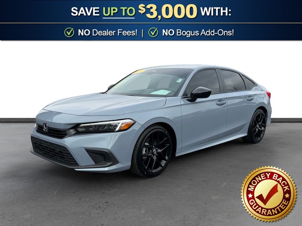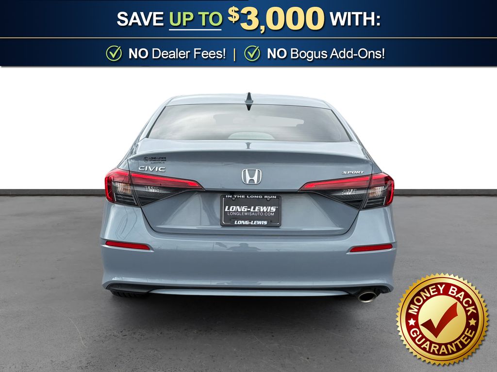 Black w/Cloth/Leatherette Seating Surfaces, 4-Wheel Disc Brakes, 8 Speakers, ABS brakes, Adaptive Cruise Control: Adaptive Cruise Control (ACC) with Low-Speed Follow, Air Conditioning, Alloy wheels, AM/FM radio, Apple CarPlay/Android Auto, Auto High-beam Headlights, Automatic temperature control, Brake assist, Bumpers: body-color, Cloth/Leatherette Seating Surfaces, Delay-off headlights, Driver door bin, Driver vanity mirror, Dual front impact airbags, Dual front side impact airbags, Electronic Stability Control, Emergency communication system: HondaLink, Exterior Parking Camera Rear, Four wheel independent suspension, Front anti-roll bar, Front Bucket Seats, Front Center Armrest, Front reading lights, Fully automatic headlights, Illuminated entry, Knee airbag, Leather Shift Knob, Leather steering wheel, Low tire pressure warning, Occupant sensing airbag, Outside temperature display, Overhead airbag, Panic alarm, Passenger door bin, Passenger vanity mirror, Power door mirrors, Power steering, Power windows, Radio data system, Radio: 180-Watt Audio System, Rear anti-roll bar, Rear side impact airbag, Rear window defroster, Remote keyless entry, Security system, Speed control, Speed-sensing steering, Steering wheel mounted audio controls, Tachometer, Telescoping steering wheel, Tilt steering wheel, Traction control, Trip computer, Wheels: 18" Gloss Black Alloy, Black w/Cloth/Leatherette Seating Surfaces. 2024 Honda Civic Sport