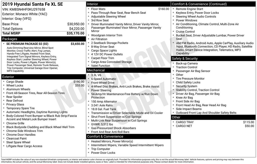 Take the whole family in comfort with this 2019 Hyundai Santa Fe XL SE, finished in Monaco White with a refined Gray Leather Interior. Powered by a strong 3.3L V6 Engine delivering 290 horsepower and paired with a 6-Speed Automatic Transmission, this SUV blends power with everyday practicality.