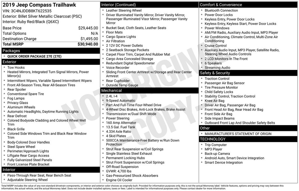 4WD, 4-Wheel Disc Brakes, 4.334 Axle Ratio, 6 Speakers, ABS brakes, Air Conditioning, Alloy wheels, AM/FM radio: SiriusXM, Anti-whiplash front head restraints, Apple CarPlay/Android Auto, Automatic temperature control, Brake assist, Bumpers: body-color, Compass, Delay-off headlights, Driver door bin, Driver vanity mirror, Dual front impact airbags, Dual front side impact airbags, Electronic Stability Control, Four wheel independent suspension, Front anti-roll bar, Front Bucket Seats, Front Center Armrest w/Storage, Front dual zone A/C, Front fog lights, Front reading lights, Fully automatic headlights, Google Android Auto, GPS Antenna Input, Heated door mirrors, Illuminated entry, Knee airbag, Leather Shift Knob, Low tire pressure warning, Manufacturer's Statement of Origin, Occupant sensing airbag, Outside temperature display, Overhead airbag, Overhead console, Panic alarm, ParkView Rear Back-Up Camera, Passenger door bin, Passenger vanity mirror, Power door mirrors, Power steering, Power windows, Premium Cloth/Leather Trim Bucket Seats, Quick Order Package 27E (DISC), Radio: Uconnect 4 w/8.4" Display, Rear anti-roll bar, Rear seat center armrest, Rear window defroster, Rear window wiper, Remote keyless entry, Roof rack: rails only, Speed control, Split folding rear seat, Spoiler, Steering wheel mounted audio controls, Tachometer, Telescoping steering wheel, Tilt steering wheel, Traction control, Trip computer, Turn signal indicator mirrors, USB Host Flip, Variably intermittent wipers, Wheels: 17" x 6.5" Painted/Bright Aluminum, 4WD. 2019 Jeep Compass Trailhawk