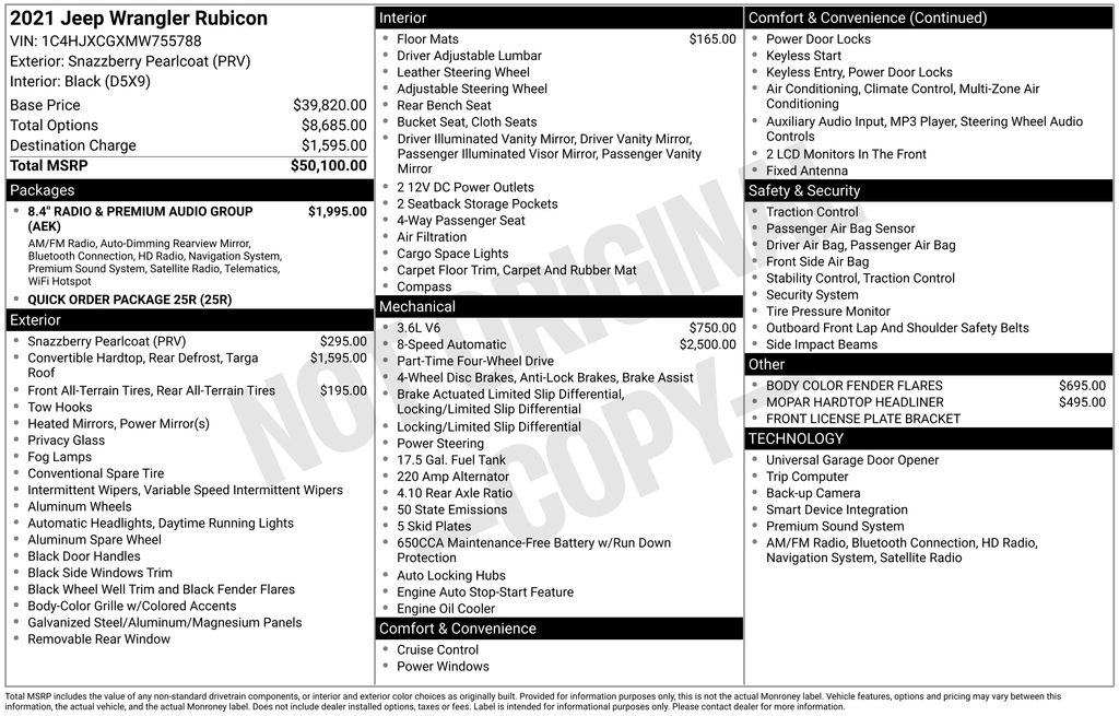 2021 Jeep Wrangler Rubicon Snazzberry Pearlcoat Rubicon 4WD 8-Speed Automatic 3.6L V6 24V VVT 1-Yr SiriusXM Guardian Trial, 4-Wheel Disc Brakes, 4.10 Rear Axle Ratio, 4G LTE Wi-Fi Hot Spot, 5-Year SiriusXM Traffic Service, 5-Year SiriusXM Travel Link Service, 8 Speakers, 8.4" Radio & Premium Audio Group, 8.4" Touchscreen Display, ABS brakes, Air Conditioning, Alloy wheels, Alpine Premium Audio System, AM/FM radio: SiriusXM, Apple CarPlay/Android Auto, Auto-Dimming Rear-View Mirror, Automatic temperature control, Black 3-Piece Hard Top, Body Color Fender Flares, Brake assist, Compass, Delay-off headlights, Driver door bin, Driver vanity mirror, Dual front impact airbags, Dual front side impact airbags, Electronic Stability Control, Emergency/Assistance Call, For Details, Visit DriveUconnect.com, Freedom Panel Storage Bag, Front anti-roll bar, Front Bucket Seats, Front Center Armrest w/Storage, Front dual zone A/C, Front fog lights, Front License Plate Bracket, Front reading lights, Fully automatic headlights, Garage door transmitter, GPS Navigation, HD Radio, Heated door mirrors, Illuminated entry, Integrated roll-over protection, Leather steering wheel, Low tire pressure warning, MOPAR All-Weather Floor Mats (DISC), MOPAR Hardtop Headliner, No Soft Top, Occupant sensing airbag, Off-Road Info Pages, Outside temperature display, Panic alarm, ParkView Rear Back-Up Camera, Passenger door bin, Passenger vanity mirror, Performance Suspension, Power door mirrors, Power steering, Power windows, Premium Cloth Low-Back Bucket Seats, Quick Order Package 25R, Radio data system, Radio: Uconnect 4 w/7" Display, Radio: Uconnect 4C Nav w/8.4" Display, Rear anti-roll bar, Rear reading lights, Rear Window Defroster, Rear Window Wiper/Washer, Remote keyless entry, Security system, SiriusXM Traffic Plus, SiriusXM Travel Link, Speed control, Steering wheel mounted audio controls, Tachometer, Telescoping steering wheel, Tilt steering wheel, Traction control, Trip computer, Variably intermittent wipers, Voltmeter, Wheels: 17" x 7.5" Machined w/Black Pockets.