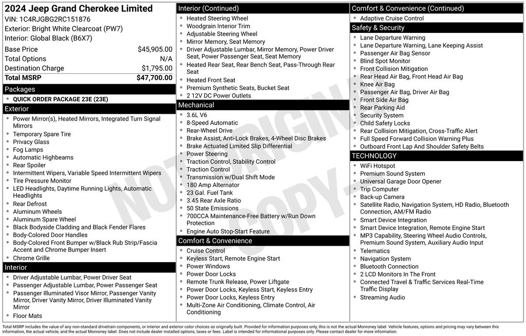 3.45 Rear Axle Ratio, 4-Wheel Disc Brakes, 6 Speakers, ABS brakes, Active Noise Control System, Air Conditioning, Alloy wheels, AM/FM radio: SiriusXM with 360L, Anti-whiplash front head restraints, Audio memory, Auto High-beam Headlights, Automatic temperature control, Brake assist, Bumpers: body-color, Capri Leatherette Seats, Compass, Delay-off headlights, Driver door bin, Driver vanity mirror, Dual front impact airbags, Dual front side impact airbags, Electronic Stability Control, Emergency communication system, Four wheel independent suspension, Front anti-roll bar, Front Bucket Seats, Front Center Armrest w/Storage, Front dual zone A/C, Front fog lights, Front License Plate Bracket, Front reading lights, Fully automatic headlights, Garage door transmitter, Heated door mirrors, Heated front seats, Heated rear seats, Heated steering wheel, Illuminated entry, Knee airbag, Low tire pressure warning, Memory seat, Navigation System, Normal Duty Suspension, Occupant sensing airbag, Outside temperature display, Overhead airbag, Overhead console, Panic alarm, ParkView Rear Back-Up Camera, Passenger door bin, Passenger vanity mirror, Power door mirrors, Power driver seat, Power Liftgate, Power passenger seat, Power steering, Power windows, Quick Order Package 23E, Radio data system, Radio: Uconnect 5 Nav w/10.1" Display, Rear anti-roll bar, Rear reading lights, Rear window defroster, Rear window wiper, Remote keyless entry, Security system, Speed control, Speed-Sensitive Wipers, Split folding rear seat, Spoiler, Steering wheel mounted audio controls, Tachometer, Telescoping steering wheel, Tilt steering wheel, Traction control, Trip computer, Turn signal indicator mirrors, Variably intermittent wipers, Voltmeter, Wheels: 18" x 8" Polished/Painted Aluminum. 2024 Jeep Grand Cherokee Limited