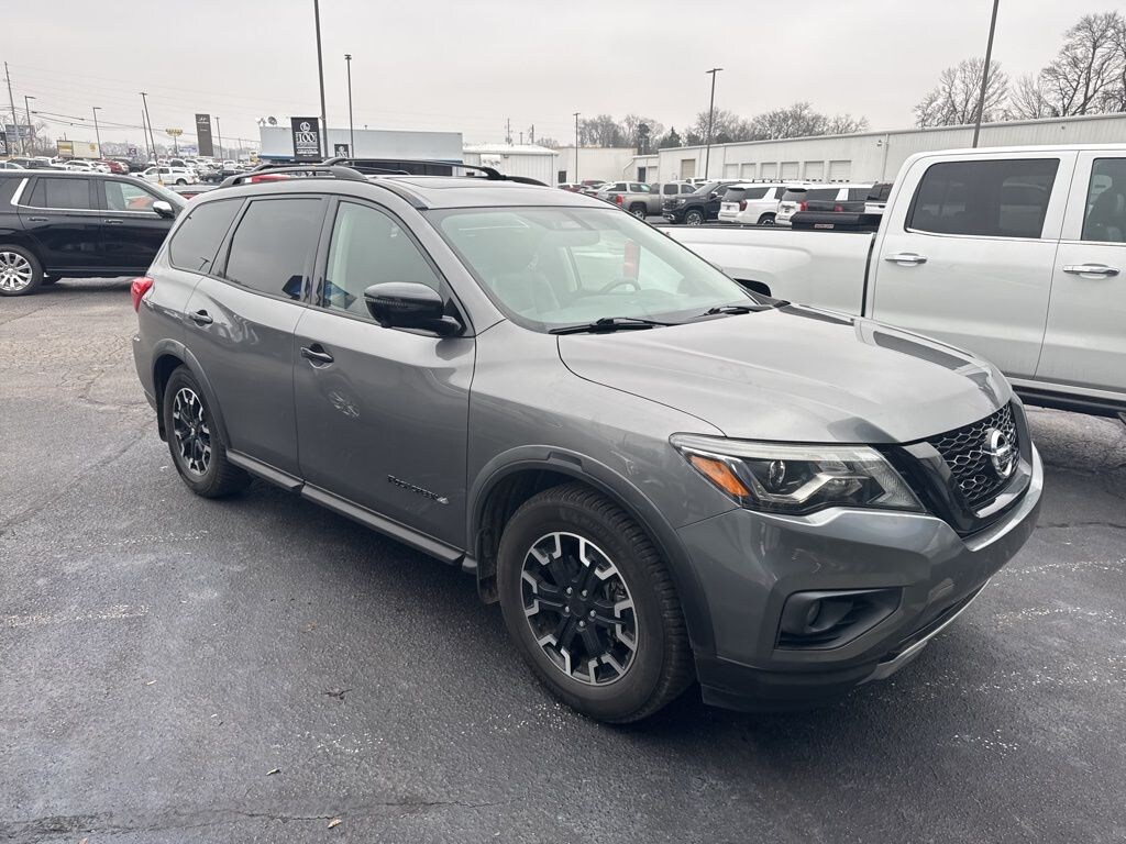 2019 Nissan Pathfinder SL Gun Metallic SL FWD CVT with Xtronic V6 3rd row seats: bench, 4-Wheel Disc Brakes, 5.25 Axle Ratio, 6 Speakers, ABS brakes, Air Conditioning, Alloy wheels, AM/FM radio: SiriusXM, AM/FM/CD Audio System, Auto-dimming Rear-View mirror, Automatic temperature control, Black Door Handles, Black Front & Rear Fascia Accents, Black License Plate Finisher, Black Mesh Grille & V-Motion, Black Molded Over Fenders, Blind Spot Warning, Bose Premium Audio System, Brake assist, Bumpers: body-color, Cargo Package, CD player, Compass, Delay-off headlights, Driver door bin, Driver vanity mirror, Dual front impact airbags, Dual front side impact airbags, Electronic Stability Control, Emergency communication system: NissanConnect Services, First Aid Kit, Four wheel independent suspension, Front anti-roll bar, Front Bucket Seats, Front Center Armrest, Front dual zone A/C, Front fog lights, Front Illuminated Kick Plates, Front reading lights, Fully automatic headlights, Garage door transmitter: HomeLink, Heated door mirrors, Heated Front Bucket Seats, Heated front seats, Heated rear seats, Heated steering wheel, Illuminated entry, Interior Accent Lighting, Leather Seating Surfaces, Leather Shift Knob, Leather steering wheel, Low tire pressure warning, Memory seat, Navigation System, NissanConnect w/Navigation & Services, Occupant sensing airbag, Outside temperature display, Overhead airbag, Overhead console, Panic alarm, Passenger door bin, Passenger vanity mirror, Power door mirrors, Power driver seat, Power Liftgate, Power Panoramic Moonroof, Power passenger seat, Power steering, Power windows, Radio data system, Rear air conditioning, Rear anti-roll bar, Rear Parking Sensors, Rear reading lights, Rear seat center armrest, Rear window defroster, Rear window wiper, Reclining 3rd row seat, Remote keyless entry, Rock Creek Edition, Rock Creek Edition Cross Bars, Rock Creek Floor & Cargo Mats, Roof rack: rails only, Security system, SiriusXM Traffic, SL Rock Creek Edition Premium Package, Speed control, Speed-sensing steering, Speed-Sensitive Wipers, Split folding rear seat, Spoiler, Steering wheel mounted audio controls, Tachometer, Telescoping steering wheel, Tilt steering wheel, Tonneau Cover, Traction control, Trailer Tow Hitch & Harness, Trip computer, Turn signal indicator mirrors, Unique Front Door Badging, Unique Lower Front Fascia, Unique Rock Creek Edition Seating Surfaces, Variably intermittent wipers, Wheels: 18" Unique Dark, Wheels: 18" x 7.5 J Machined Aluminum-Alloy.