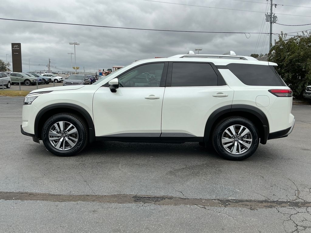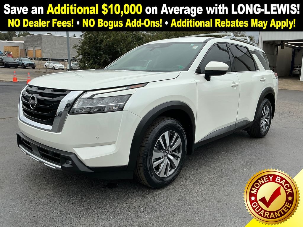 2022 Nissan Pathfinder SL Pearl White Tricoat SL FWD 9-Speed Automatic V6 18" Machined Alloy Wheels, 3rd row seats: bench, 4-Wheel Disc Brakes, 6 Speakers, ABS brakes, Air Conditioning, Alloy wheels, AM/FM radio: SiriusXM, Auto High-beam Headlights, Auto-dimming Rear-View mirror, Automatic temperature control, Axle Ratio: TBD, Bench Seat Carpeted Floor Mats (Set of 4), Black Splash Guards (Set of 4), Brake assist, Bumpers: body-color, Cross Bars, Delay-off headlights, Driver door bin, Driver vanity mirror, Dual front impact airbags, Dual front side impact airbags, Electronic Stability Control, Emergency communication system: NissanConnect Services, Exterior Parking Camera Rear, Four wheel independent suspension, Front anti-roll bar, Front Bucket Seats, Front Center Armrest, Front dual zone A/C, Front fog lights, Front reading lights, Fully automatic headlights, Garage door transmitter: HomeLink, Heated door mirrors, Heated Front Bucket Seats, Heated front seats, Heated steering wheel, Illuminated entry, Knee airbag, Leather Seating Surfaces, Leather steering wheel, Low tire pressure warning, Navigation system: NissanConnect Navigation, NissanConnect w/Navigation & Services, Occupant sensing airbag, Outside temperature display, Overhead airbag, Overhead console, Panic alarm, Passenger door bin, Passenger vanity mirror, Power door mirrors, Power driver seat, Power Liftgate, Power passenger seat, Power steering, Power windows, Radio data system, Radio: AM/FM Audio System, Rear air conditioning, Rear anti-roll bar, Rear reading lights, Rear seat center armrest, Rear side impact airbag, Rear window defroster, Rear window wiper, Reclining 3rd row seat, Remote keyless entry, Security system, Speed control, Speed-sensing steering, Split folding rear seat, Spoiler, Steering wheel mounted audio controls, Tachometer, Telescoping steering wheel, Tilt steering wheel, Traction control, Trip computer, Turn signal indicator mirrors, Variably intermittent wipers.