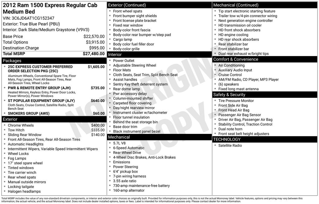 2012 Ram 1500 Express True Blue Pearlcoat Express RWD 6-Speed Automatic HEMI 5.7L V8 Multi Displacement VVT 17" x 7" Argent Steel Wheels, 20" x 8" Aluminum Wheels, 20" x 9" Chrome Clad Aluminum Wheels, 3.55 Rear Axle Ratio, 4-Wheel Disc Brakes, 40/20/40 Split Bench Seat, 6 Speakers, ABS brakes, Air Conditioning, AM/FM radio, Black Exterior Mirrors, Body Color Front Fascia, Body Color Grille, Body Color Rear Bumper w/Step Pads, Brake assist, Carpet Floor Covering, CD player, Center Hub, Cigar Lighter, Class IV Receiver Hitch, Cloth 40/20/40 Bench Seat, Delay-off headlights, Driver door bin, Dual front impact airbags, Dual front side impact airbags, Dual Rear Exhaust w/Bright Tips, Electronic Stability Control, Exterior Mirrors Heating Element, Fog Lamps, Front anti-roll bar, Front Center Armrest, Front Floor Mats, Front wheel independent suspension, Fully automatic headlights, Heavy Duty Vinyl 40/20/40 Split Bench Seat, Highline Door Trim Panel, Low tire pressure warning, Occupant sensing airbag, Overhead airbag, Passenger door bin, Power & Remote Entry Group, Power Heated Fold-Away Mirrors, Power Locks, Power steering, Power Windows w/Front One-Touch Down, Quick Order Package 25C Ram 1500 Express, Radio: Uconnect 130 AM/FM/CD/MP3, Ram 1500 Express, Rear anti-roll bar, Rear Sliding Window, Rear step bumper, Remote Keyless Entry, Removable Ash Tray, SIRIUS Satellite Radio, Smoker's Group, Speed Control, ST Popular Equipment Group, Tachometer, Tilt steering wheel, Traction control, Variably intermittent wipers, Voltmeter.