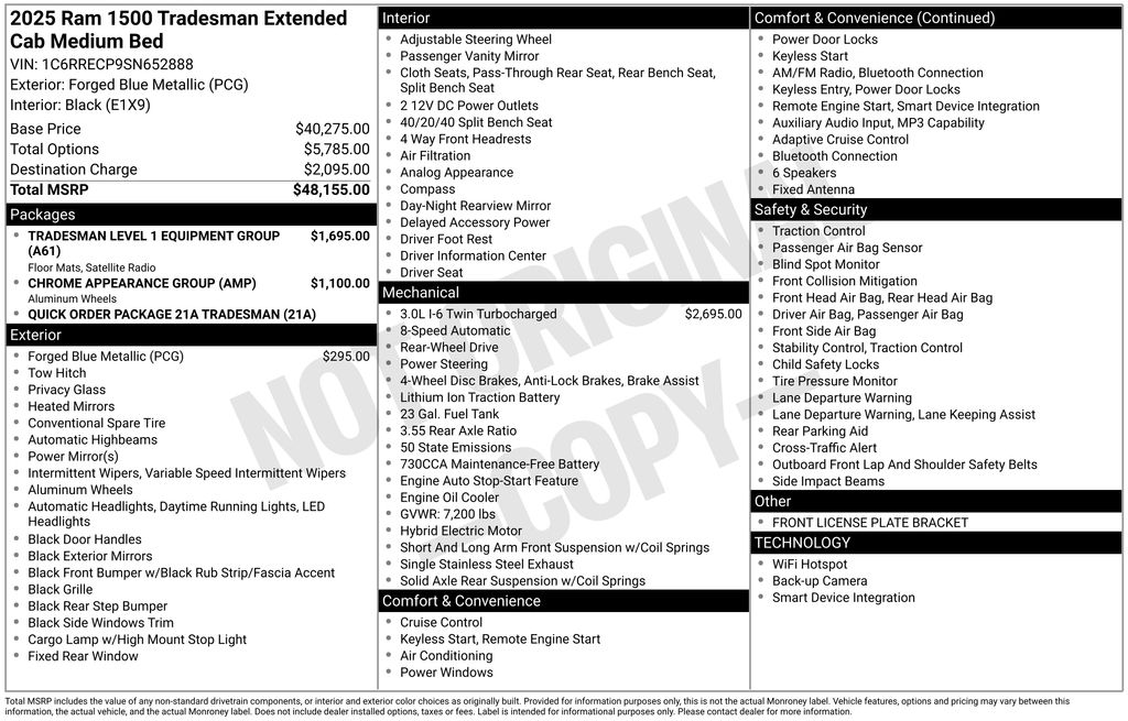 3 Rear Seat Head Restraints, 4 Way Front Headrests, 4-Wheel Disc Brakes, 40/20/40 Split Bench Seat, 6 Speakers, ABS brakes, Air Conditioning, AM/FM radio, Apple CarPlay/Android Auto, Auto High-beam Headlights, Black Exterior Mirrors, Black Exterior Truck Badging, Black RAM Grille Badge, Brake assist, Bright Front Bumper, Bright Rear Bumper, Chrome Appearance Group, Chrome Headlamp Bezels, Chrome RAM Grille Badge, Cloth Bench Seat, Compass, Delay-off headlights, Driver door bin, Dual front impact airbags, Dual front side impact airbags, Electronic Stability Control, Exterior Mirrors w/Heating Element, Front & Rear Floor Mats, Front anti-roll bar, Front Center Armrest, Front Center Seat Cushion Storage, Front License Plate Bracket, Front reading lights, Front Seat Back Map Pockets, Front wheel independent suspension, Fully automatic headlights, Grille Surround 1 Chrome Texture 1 Black, Heated door mirrors, Heavy Duty Vinyl 40/20/40 Split Bench Seat, Illuminated entry, Low tire pressure warning, Manual Adjust 4-Way Driver Seat, Manual Adjust 4-Way Front Passenger Seat, Manual Folding Exterior Mirrors, Occupant sensing airbag, Outside temperature display, Overhead airbag, Overhead console, Panic alarm, ParkView Rear Back-Up Camera, Passenger door bin, Passenger vanity mirror, Power door mirrors, Power steering, Power windows, Quick Order Package 21A Tradesman, Radio data system, Radio: Uconnect 5 w/8.4" Display, Rear 60/40 Folding Seat, Rear anti-roll bar, Rear Power Sliding Window, Rear step bumper, Remote keyless entry, SiriusXM Satellite Radio, Speed control, Tachometer, Telescoping steering wheel, Tilt steering wheel, Traction control, Tradesman Level 1 Equipment Group, Variably intermittent wipers, Voltmeter, Wheels: 18" x 7.5" Steel Painted, Wheels: 18" x 8" Cast-Aluminum Painted. 2025 Ram 1500 Tradesman