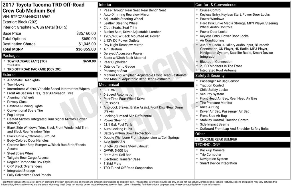 2017 Toyota Tacoma **Here at Long-Lewis we believe in being transparent. We have no Doc fees, or any other hidden fees. We are a one price store and give our best price up front and they are clearly marked on all our inventory.** Black 4WD 6-Speed V6 4WD.