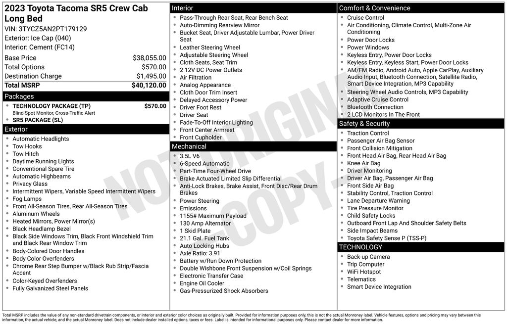 2023 Toyota Tacoma V6 White V6 4WD 6-Speed 3.5L V6 4WD, 120V/400W Deck Mounted AC Power, ABS brakes, Air Conditioning, Alloy wheels, AM/FM radio: SiriusXM, Anti-whiplash front head restraints, Apple CarPlay/Android Auto, Auto High-beam Headlights, Auto-dimming Rear-View mirror, Auto-Dimming Rearview Mirror w/HomeLink, Automatic temperature control, Blind Spot Monitor w/Rear Cross Traffic Alert, Brake assist, Bumpers: body-color, Driver door bin, Dual front impact airbags, Dual front side impact airbags, Electronic Stability Control, Emergency communication system: Safety Connect (1-year trial), Engine Immobilizer, Exterior Parking Camera Rear, Front anti-roll bar, Front Bucket Seats, Front Center Armrest, Front dual zone A/C, Front fog lights, Front reading lights, Front wheel independent suspension, Garage door transmitter: HomeLink, Heated door mirrors, Illuminated entry, Knee airbag, Leather Shift Knob, Low tire pressure warning, Occupant sensing airbag, Outside temperature display, Overhead airbag, Overhead console, Panic alarm, Passenger door bin, Power door mirrors, Power driver seat, Power Sliding Rear Window w/Privacy Glass, Power steering, Power windows, Rear Parking Assist Sonar, Rear step bumper, Remote keyless entry, Security system, Speed control, Speed-sensing steering, Split folding rear seat, Steering wheel mounted audio controls, Tachometer, Telescoping steering wheel, Tilt steering wheel, Traction control, Trip computer, Turn signal indicator mirrors, Variably intermittent wipers, 4WD.